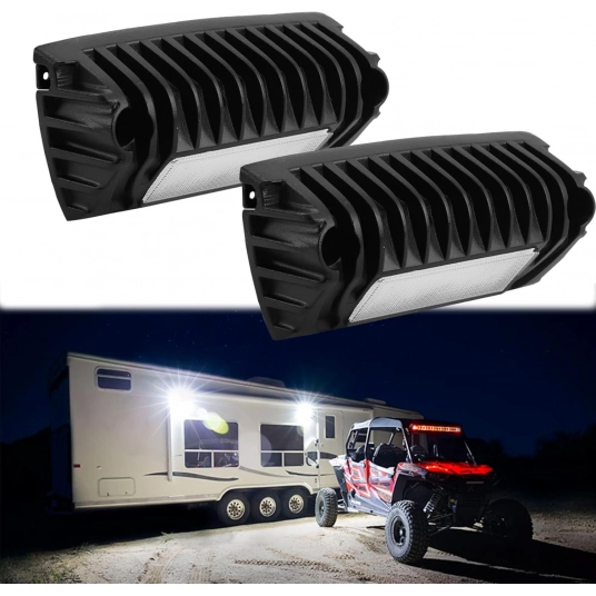 Powerful and bright, these outdoor LED lights are meant to go on the exterior of your truck or van and this set of 2 lights will light up the entire area around your service window.  Weatherproof housing. 12 volts to run right off the truck battery.